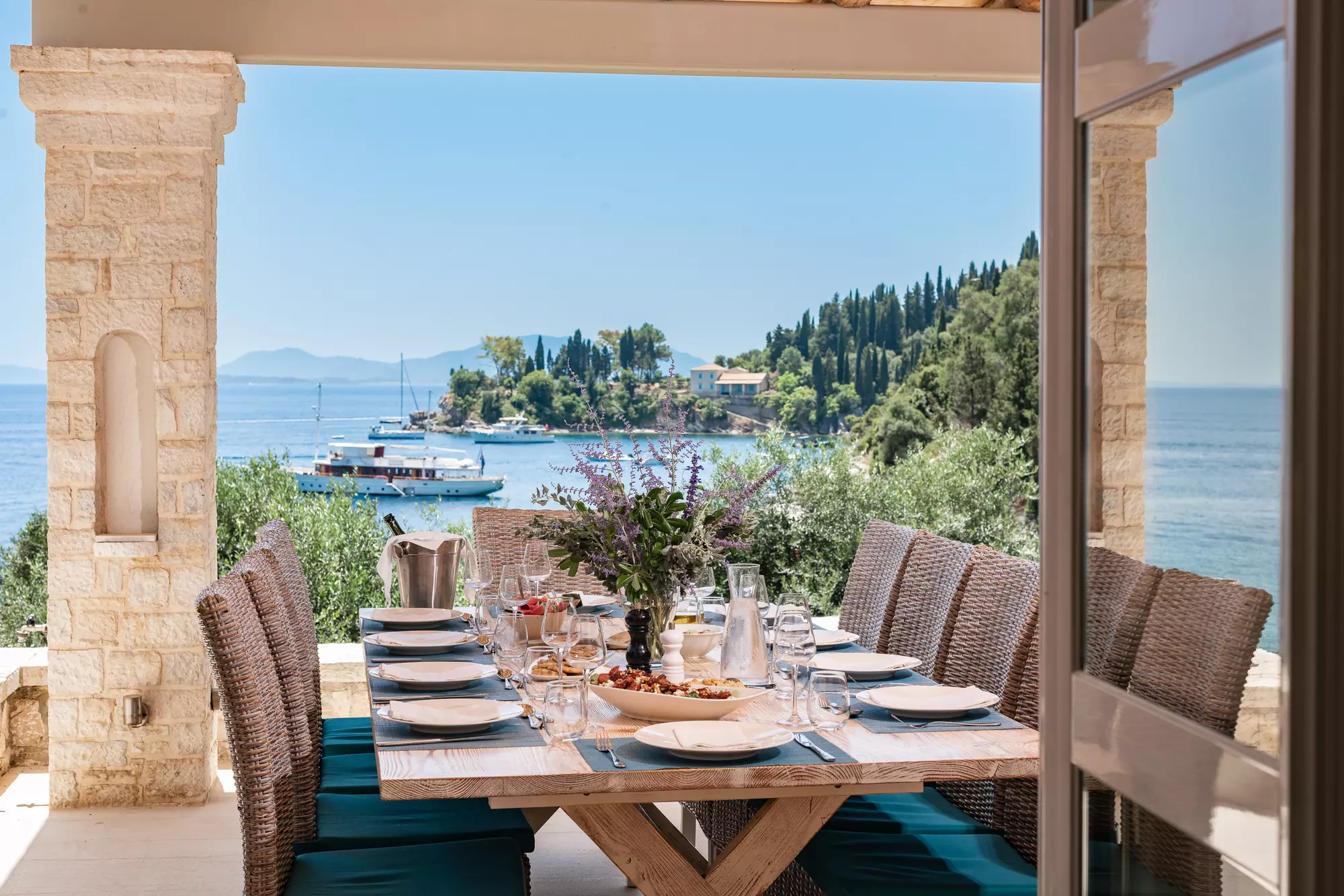 Large lounge with terrace looking out towards Corfu Town. The outdoor dining table seats at least 12 people but a section can be removed for smaller parties. The view from the lounge and terrace is truly stunning and there are ample sofas and armchairs from which to enjoy a glass of wine and the view. Portable sound system for music/radio.