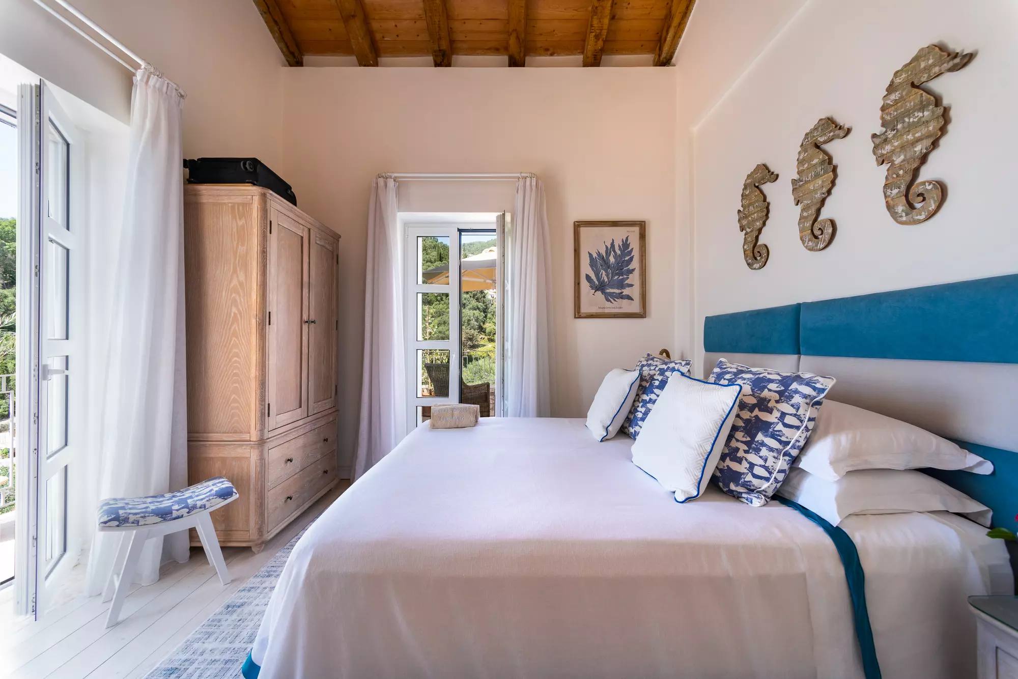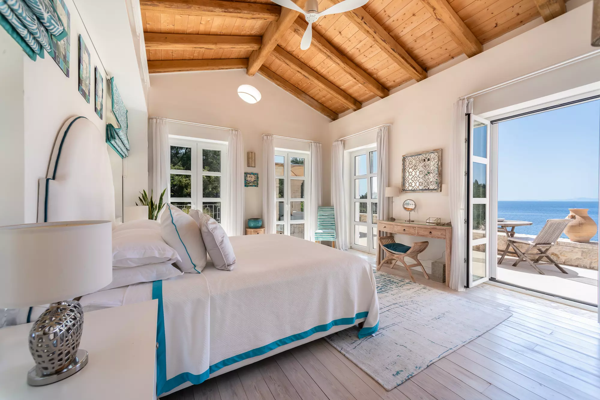 Super king bed with sea views and extensive terrace with daybed and outside bath.