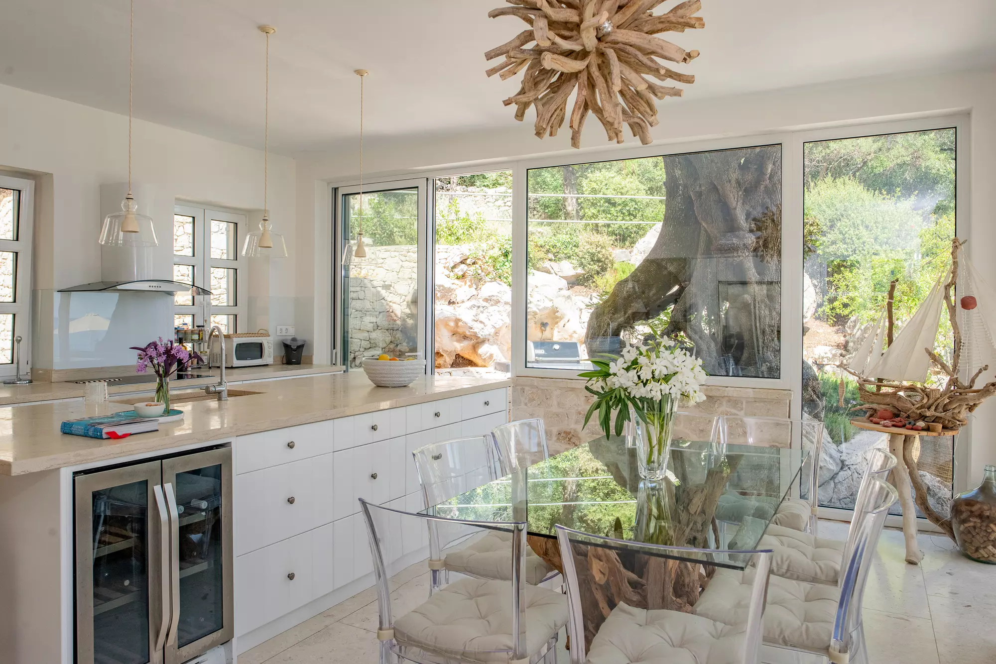 The kitchen is fully equipped with a range size ceramic hob and oven, dishwasher, wine cooler, American style fridge freezer with double-filtered water and ice dispenser, separate water cooler, Nespresso coffee machine, filter coffee machine, second large fridge (in outside pantry) and Weber gas BBQ.