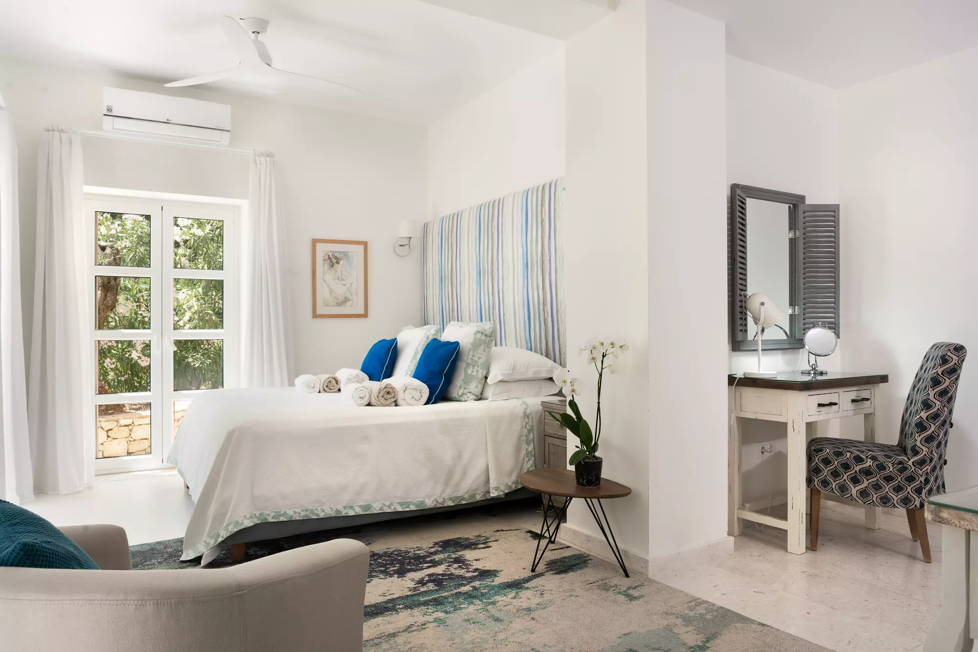 Extensive private terraces throughout the garden provide space to relax. Various shaded and sunny seating areas spread throughout the olive grove.