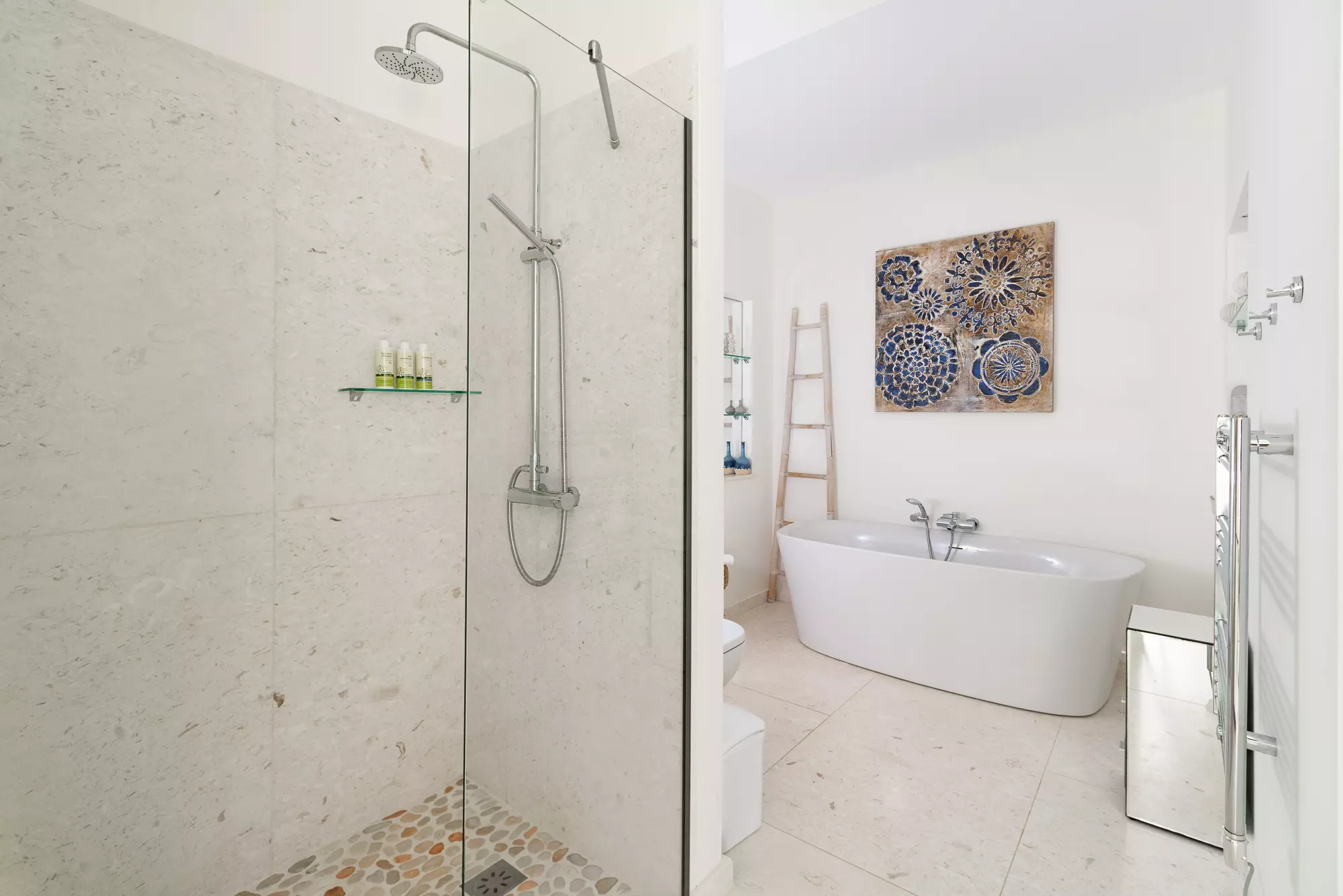 2 master suites and 4 further elegant spacious double bedrooms all with sea views and sea facing terraces. All beds can be super king size or split into singles with the exception of the upstairs master suite, which is always super king. All bedrooms have en suite shower rooms and the 2 masters also have baths.